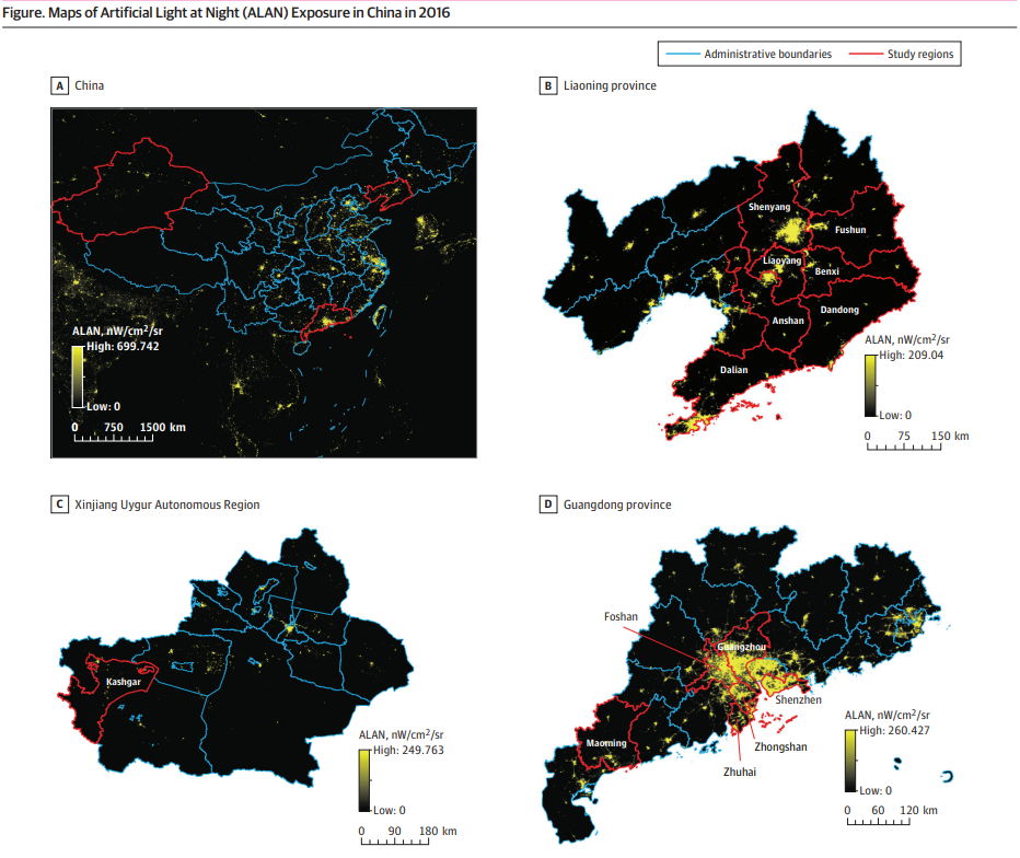 健康的睡眠对儿童身体发育和心理健康至关重要。目前的系统综述显示,我国儿童睡眠问题患病率约高达37.6%,已成为我国儿童青少年重大的公共健康问题。因此,识别导致睡眠障碍的影响环境因素,并对其进行有效干预具有非常重要的理论和现实指导意义。基于此,best365中国官方网站公共卫生学院董光辉教授团队在广东省、辽宁省和新疆维吾尔自治区(见图1)共选取14个城市55个行政区的201,994名儿童青少年,利用卫星图像评估了居住地址500m范围的室外夜光暴露,并进一步探讨了室外夜光和儿童青少年睡眠障碍及其亚型的关联性。