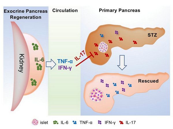 该研究发现干细胞介导的异位新生的胰腺外分泌腺可以修复原位外分泌胰腺、改善炎症微环境,促进胰岛修复以治疗糖尿病;机制上发现异位外分泌腺再生通过启动IL-6/TNF-α/IFN-γ轴发挥抑制IL-17、保护胰岛的作用;提出局部组织器官再生治疗全身疾病的新理念。