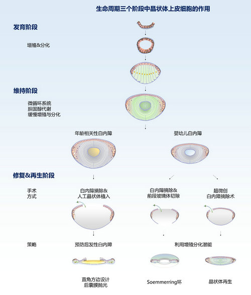 晶状体手术后,我们可以驾驭晶状体上皮细胞增殖分化的生物学特性用于临床治疗。晶状体上皮细胞的不完全分化与纤维化产生混浊的组织,完全分化、有序排列产生透明的晶状体纤维组织。在人工晶状体眼内,植入的假体发挥光学作用,晶状体上皮细胞的增殖会影响人工晶状体的功能。可以采用人工晶状体的直角方边屏障效应和后囊液流抛光技术等,清除或抑制晶状体上皮细胞。在婴幼儿,可以改进白内障摘除时的前、后撕囊口大小,促进无晶状体眼周边部Soemmerring 环的形成,利于II期囊袋内植入人工晶状体;或者通过晶状体超微创手术,移除混浊晶状体内容物而保留晶状体上皮细胞,可原位再生出有屈光力的透明晶状体,改善婴幼儿白内障的预后。