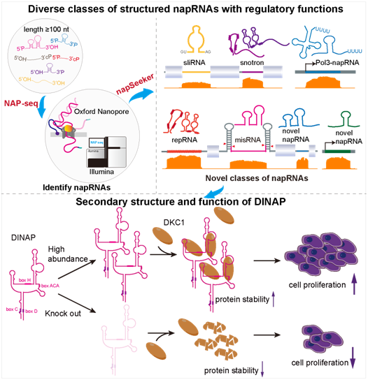 中大新闻网讯(通讯员熊丽娜)人类基因组是由约30 亿个字符组成的遗传“密码本”,决定细胞和个体发育的命运。该“密码本”的98%字符都是具有“暗物质”之称的非编码序列,而且约80%能够转录成为 “暗物质”核糖核酸(RNA)。这些“暗物质”RNA大多数都是不具有帽子结构的RNA(noncapped RNA,napRNA),且普遍作为非编码RNA(ncRNA)在基因表达调控和疾病发生发展中扮演了重要角色。然而,目前的研究主要集中于具有帽子结构的RNA(capped RNA,capRNA)和短的napRNA,人们对长的napRNA(序列长度≥100核苷酸)的种类组成、结构、生物生成及功能机制都知之甚少。