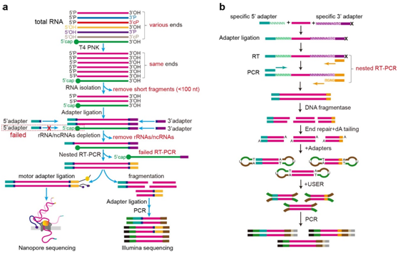 由于napRNA一般不具有polyA尾,因此传统的利用PolyA富集的RNA-seq方法无法鉴定napRNA。即使是测定total RNA的RNA-seq方法,由于通过随机六聚体引物对片段化的RNA进行逆转录(RT)产生cDNA,也导致无法鉴定全长的napRNA序列和不能用于分类napRNA及不能用于确定其二级结构等等。虽然通过小RNA测序(sRNA-seq)技术测定短napRNA发现了一些功能性小非编码RNA(如:miRNA,piRNA),然而几乎所有涉及sRNA-seq的研究都集中在小于50 核苷酸的napRNA,而不是各种长度和不同末端修饰的所有napRNA,尤其是长链(≥100 核苷酸)和结构复杂的napRNA。针对这些问题,研究团队开发了一种捕获长链napRNA的全长序列的新测序方法—NAP-seq,具体的简化步骤包括:对RNA样品进行除杂、T4 PNK修复RNA末端、长度筛选、自主设计的3’端接头和5’端接头连接、非目标RNA的去除、巢式RT-PCR与预扩增、可选地片段化、在两种不同的测序平台(Oxford Nanopore三代单分子测序平台和Illumina二代测序平台)测序和开发新算法鉴定napRNA等步骤(图1)。