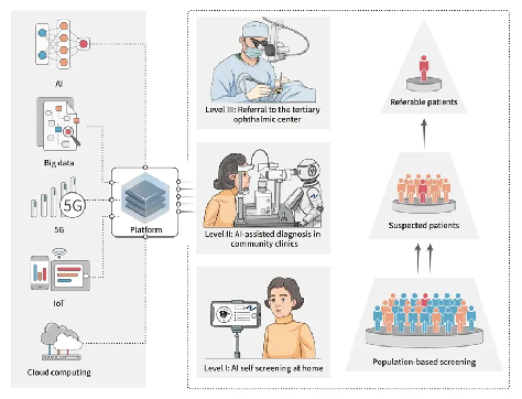 “新型三级诊疗模式”依托人工智能、大数据、5G、物联网与云计算等数字化智能技术,共分为三个步骤。第一步,居民在家使用智能移动终端拍摄眼部照片,通过AI完成眼病的初步筛查。第二步,可疑患者将被引导至社区卫生服务中心进行AI检查评估。第三步,需转诊的患者将被转至三级专科医院进行治疗。此模式将大大减少筛查成本,并可避免不必要转诊造成的医疗资源浪费,有效提升优质医疗资源利用效率,指导高效开展基于人群的大规模白内障筛查。