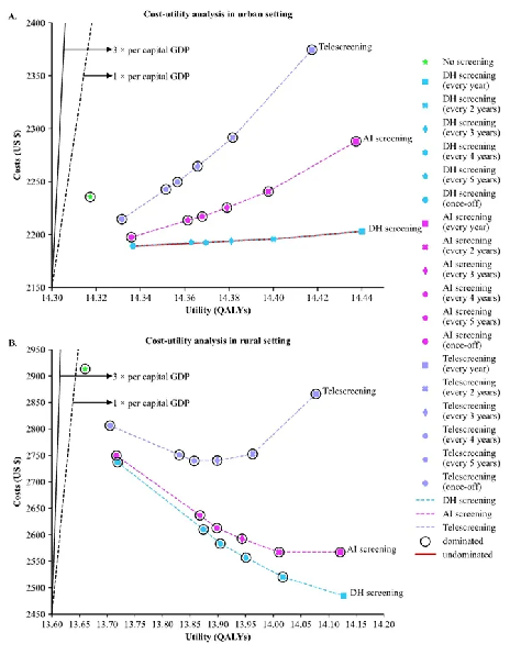 本研究通过构建马尔可夫模型,对中国城市、农村场景模拟10万人次的白内障自然发展过程,实现不同筛查策略下白内障诊疗的成本效益和成本效用分析。结果表明,相对于不筛查、远程筛查和传统AI筛查模式,“新型三级诊疗模式”在中国城乡均具有最高的卫生经济学价值。此外,每年进行新型三级筛查有助于早期患者检出和及时转诊,是成本效益最优的方案,可有效减少6.24%的总成本,增加人群1.78%的质量调整生命年,总共避免人群15.50%的盲年。