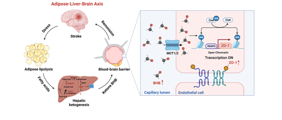 中大新闻网讯(通讯员张玉琦)脑卒中(Stroke)是目前世界范围内导致残疾的首要原因,也是致死的第二大原因,给家庭和社会造成巨大负担。肥胖是增加卒中发病率的重要危险因素。然而,与正常体重或偏瘦人群相比,超重或肥胖的卒中患者往往预后更好,死亡率更低。这一看似矛盾的现象被称为“肥胖悖论”。有研究认为肥胖人群本身具有更为丰富的能量储备,能够抵抗脑卒中后过强的分解代谢过程,可能提高对疾病的耐受程度。在脑卒中病程中,激活的下丘脑-垂体-肾上腺轴及交感神经系统可通过调控糖原分解、脂肪酸氧化等多种途径,促进分解代谢,以应对突如其来的应激反应。作为高度活跃的代谢器官,脂肪组织在卒中后动员明显增强,甘油三酯水解后生成大量游离脂肪酸,并在进入肝脏后合成酮体以快速供能。作为机体内最主要的酮体类型——β羟丁酸(BHB)不仅是大脑理想的替代能量底物,更是关键的信号转导、表观遗传修饰分子,具有抗氧化、抗炎等多种生物学效应。那么,卒中早期的肝脏生酮是否与脑卒中的转归相关?