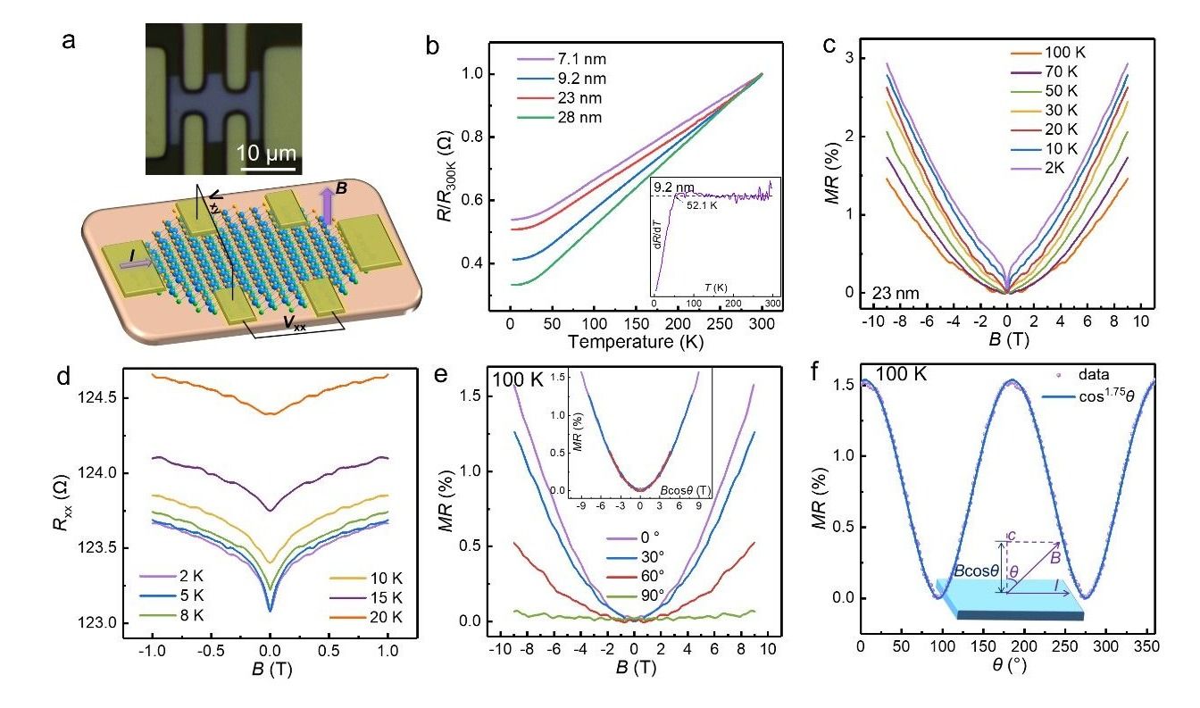 图2. Janus Bi2TeSe2纳米片的输运测试。(a) Hall bar器件;(b) 线性变温电阻;(c)变温磁阻曲线; (d)WAL效应;(e, f) 磁阻的角度依赖性.