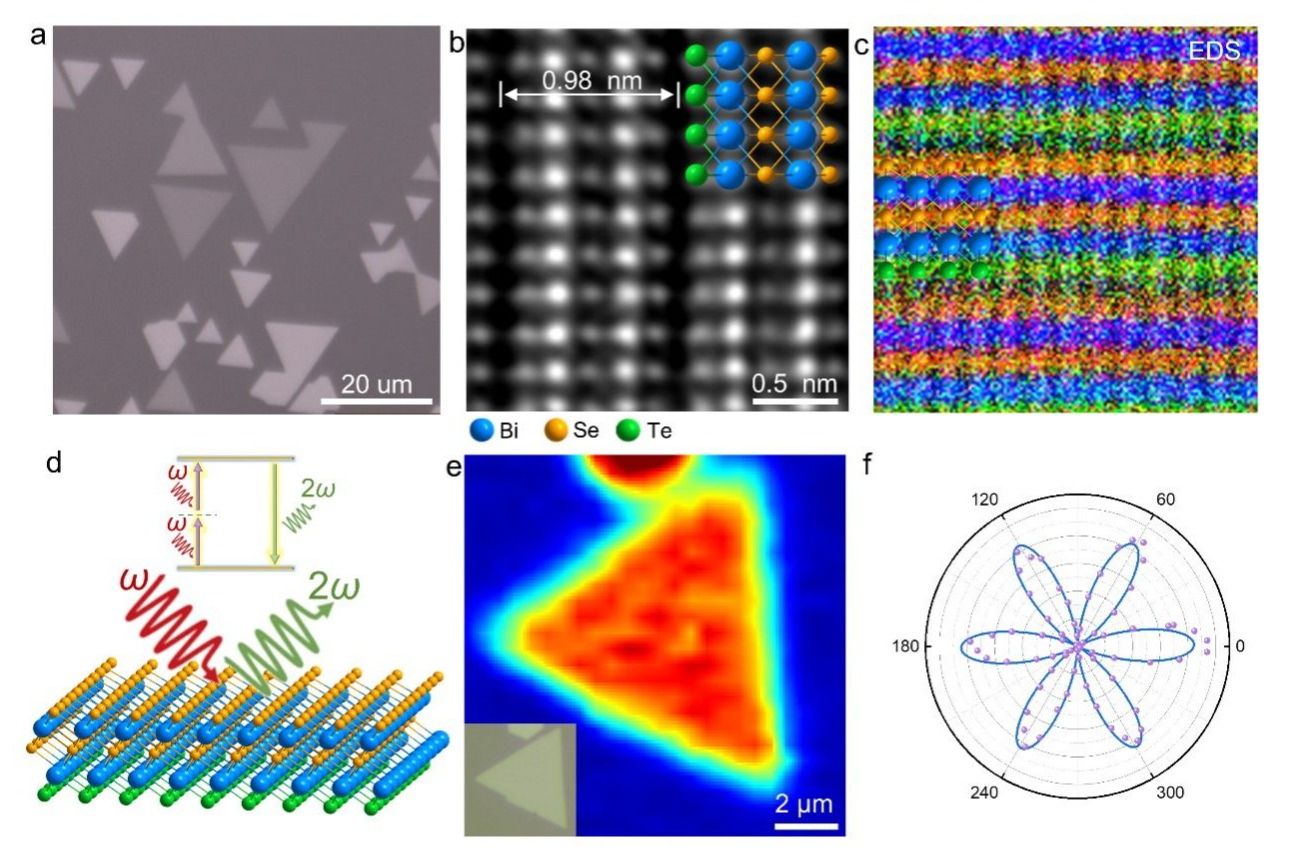 图1. Janus Bi2TeSe2纳米片的表征以及SHG测试。(a) 显微图像;(b) HAADF-STEM图像;(c)原子级EDS mapping; (d) SHG原理图;(e) SHG mapping; (f) 极化相关SHG.
