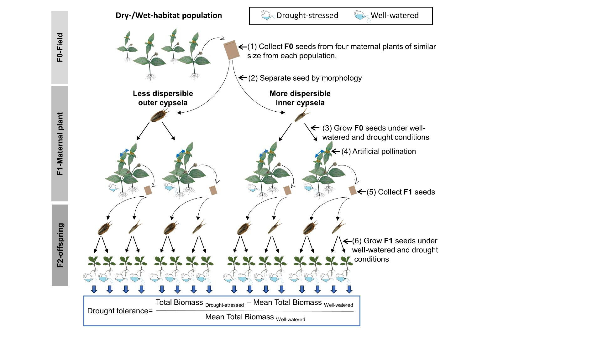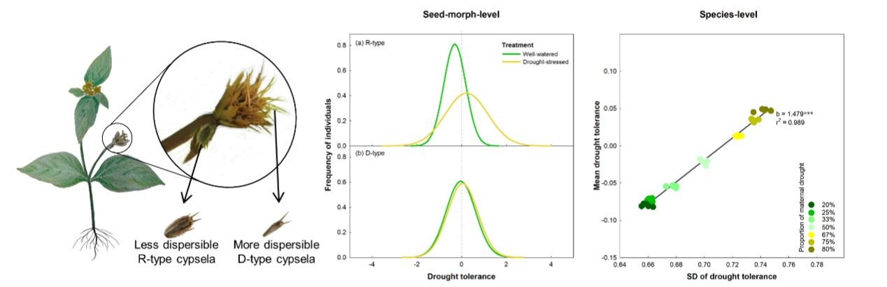彭少麟团队从水分胁迫出发,以全球广布的菊科种子二型性植物金腰箭为研究对象,构建两年三代水分处理实验,详细测定每株植物干旱胁迫与对照处理下产生的后代数量和耐旱性,首次报道了亲本干旱诱导子代种内耐旱性变异变化与子代传播能力的相关性(图1)。结果表明,经历干旱胁迫后,亲本显著提高了传播能力较弱子代的耐旱性均值或变异,这种变化能够在种群水平上得到体现,从而增强整个种群应对水分环境不确定性的适应能力(图2)。胁迫耐受力变异和种子传播能力存在较强交互作用,这可能是促进种子二型性物种广泛分布的潜在适应性进化路径,强调了种子二型性和胁迫耐受力变异对植物在多变环境下避免繁殖失败风险的重要生态意义。