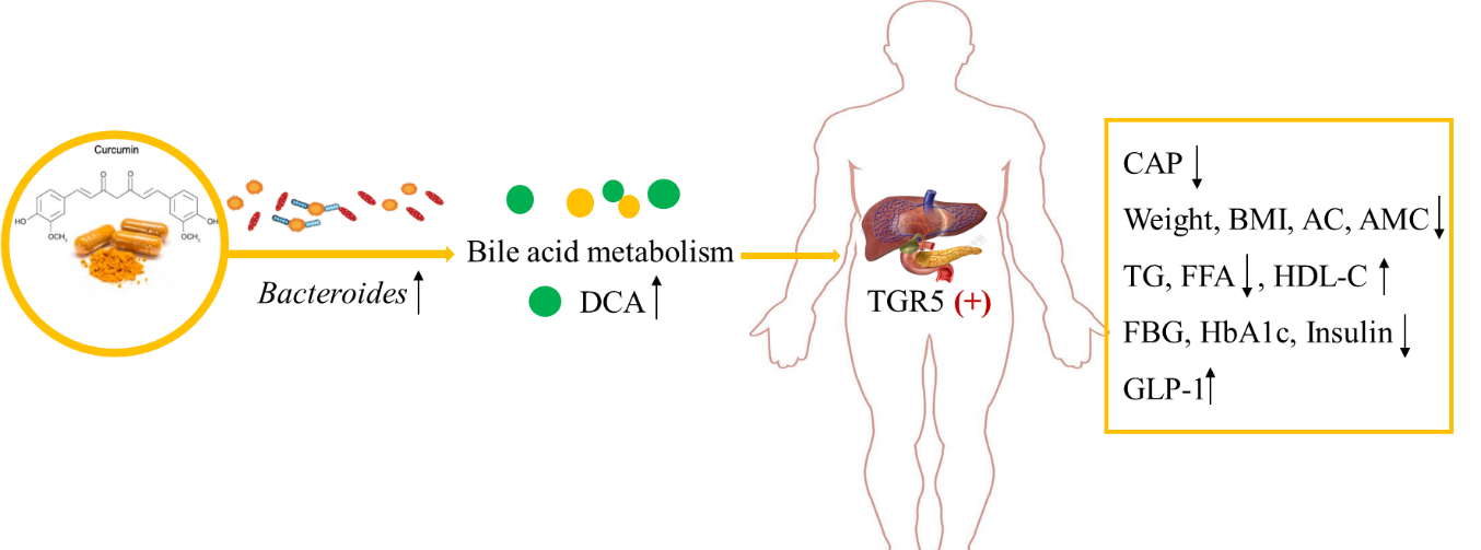 本研究采用随机对照试验,基于FibroTouch的受控衰减参数(CAP)和肝脏硬度测量(LSM)分别评估肝脏脂肪含量和肝脏硬度。结果发现:与安慰剂组相比,姜黄素干预24周后显著降低NASFL患者肝脏脂肪含量、体重和体质指数以及血清游离脂肪酸、甘油三酯、空腹血糖、糖化血红蛋白和胰岛素水平,而升高HDL-C水平。肠道菌群分析结果表明姜黄素干预显著降低厚壁菌门与拟杆菌门的比值,并显著增加与胆汁酸代谢密切相关的拟杆菌属相对丰度。血清胆汁酸靶向代谢组学分析发现姜黄素干预24周后,G蛋白偶联受体5(TGR5)最有效的激活剂脱氧胆酸(DCA)血清水平显著升高。此外,姜黄素干预明显增加外周血单核细胞TGR5 mRNA表达量和血清胰高血糖素样肽-1(GLP-1)水平。