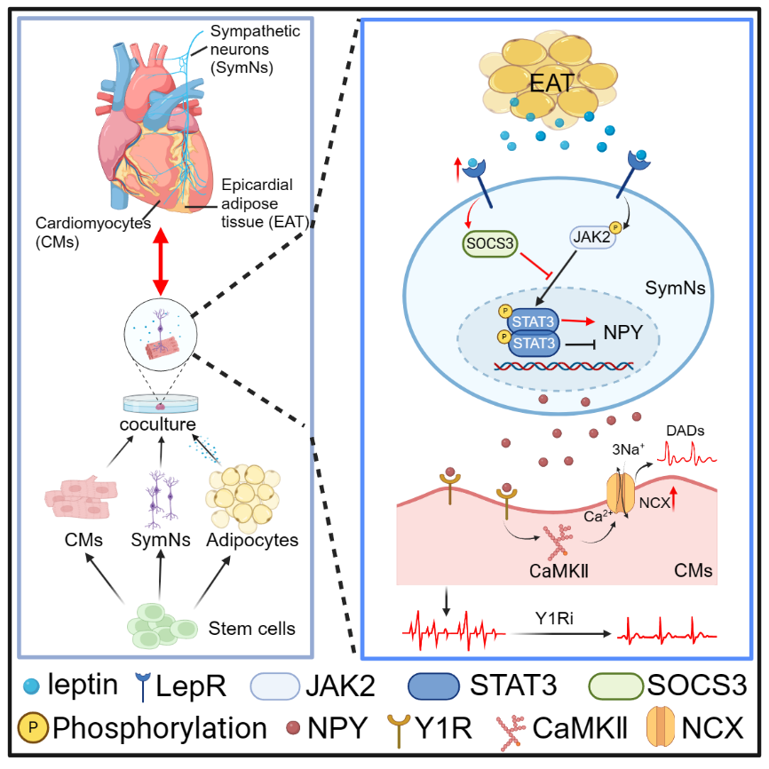 中大新闻网讯(通讯员张玉琦)心律失常(Arrhythmia)影响着全球超过1200万人,且发病率也在不断上升,是心源性猝死的主要原因之一。心律失常诱发因素众多,研究表明交感神经系统(Sympathetic nervous system, SNS)活动异常和心外膜脂肪(Epicardial adipose tissue, EAT)增厚是心律失常发生的重要的独立风险因素。心外膜脂肪包绕着大部分心脏交感神经,两者特殊的位置关系提示心外膜脂肪和心交感神经之间的相互作用可能在心律失常发生中扮演重要的角色。然而,由于物种差异和伦理限制,目前尚无直接证据证明脂肪-交感神经相互作用参与心律失常的发生。