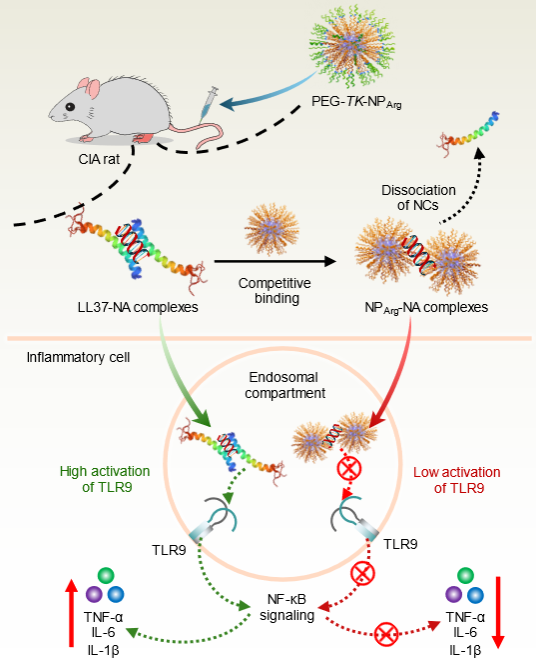 该研究揭示了阳离子聚精氨酸纳米粒与NA形成复合物中DNA链段间距远小于LL37-NA复合物的,这个变化导致复合物中DNA链段间距不能与TLR9二聚体空腔匹配,不能诱导更多的TLR9聚集及形成下游的信号转导通路放大,从而抑制TLR9的过度激活。在胶原性关节炎大鼠模型中,研究证实了这种纳米粒子能够显著抑制关节炎的症状。这一发现不仅深化了我们对阳离子材料抑制自身免疫疾病机制的理解,而且为开发针对游离核酸相关各种慢性和急性炎症疾病的新型治疗方案提供了有力的科学指导。另外,这种通过材料调控核酸与TLR相关作用的研究还可望为设计更有效安全的新型疫苗佐剂提供借鉴。