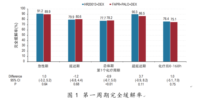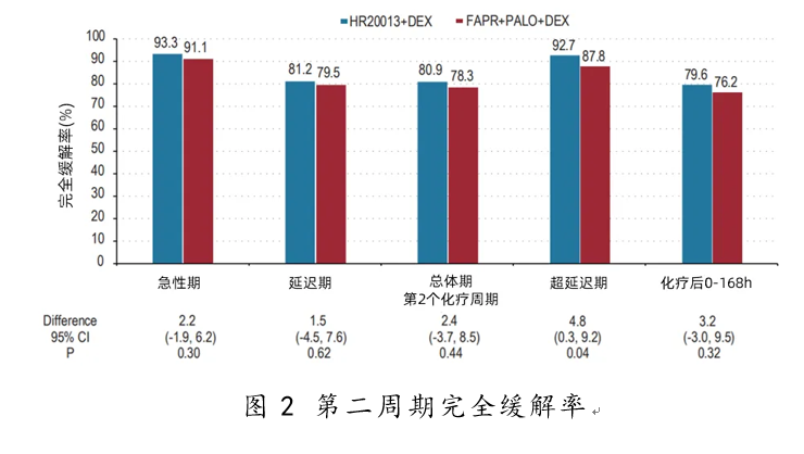 第一周期总体期的完全缓解率分别为77.7% vs 78.2%(差异为-0.9%[95% CI:-6.7,5.0];单侧P<0.01),显示主要终点达到非劣效性(图1)。同时,该Ⅲ期临床研究数据显示出了HR20013在超延迟期的疗效,无论是第一周期还是第二周期,HR20013超延迟期完全缓解率数值均高于FAPR+PALO(第一周期:90.3% vs 86.5%;第二周期:92.7% vs 87.8%;图1、2)。