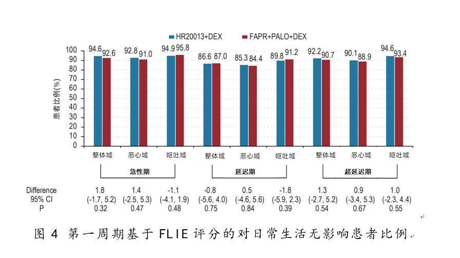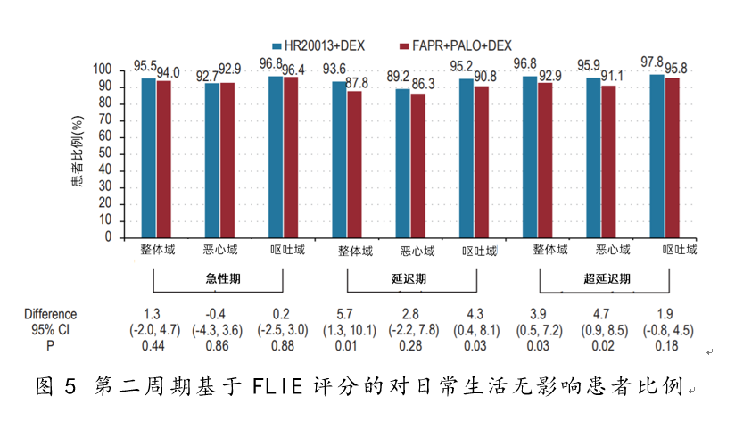 在第一周期的3个阶段[急性期、延迟期和超延迟期]中,两组的对日常生活无影响(NIDL)患者比例在整体域、恶心域和呕吐域大体相当(所有的名义双侧P>0.05;图4)。在第二周期中,与FAPR+PALO+DEX组相比,HR20013+DEX组的整体域延迟期(93.6% vs 87.8%;名义双侧P=0.01)、呕吐域延迟期(95.2% vs 90.8%;名义双侧P=0.03)、整体域超延迟期(96.8% vs 92.9%;名义双侧P=0.03)、恶心域超延迟期(95.9% vs 91.1%;名义双侧P=0.02)对日常生活无影响(NIDL)患者比例更高(图5)。