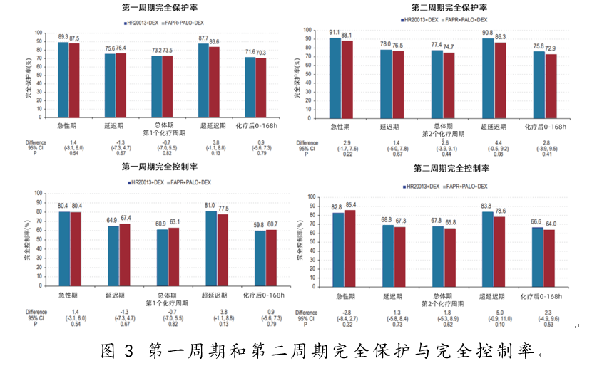 在超延迟期阶段,HR20013+DEX组的完全保护率(CP;无呕吐/无挽救治疗/无显著恶心[视觉模拟量表得分<25mm])和完全控制率(TC;无呕吐/无挽救治疗/无恶心[视觉模拟量表得分<5mm])数值上优于对照组,尤其是在第二周期(CP:90.8% vs 86.3%;TC:83.8% vs 78.6%;图3)。
