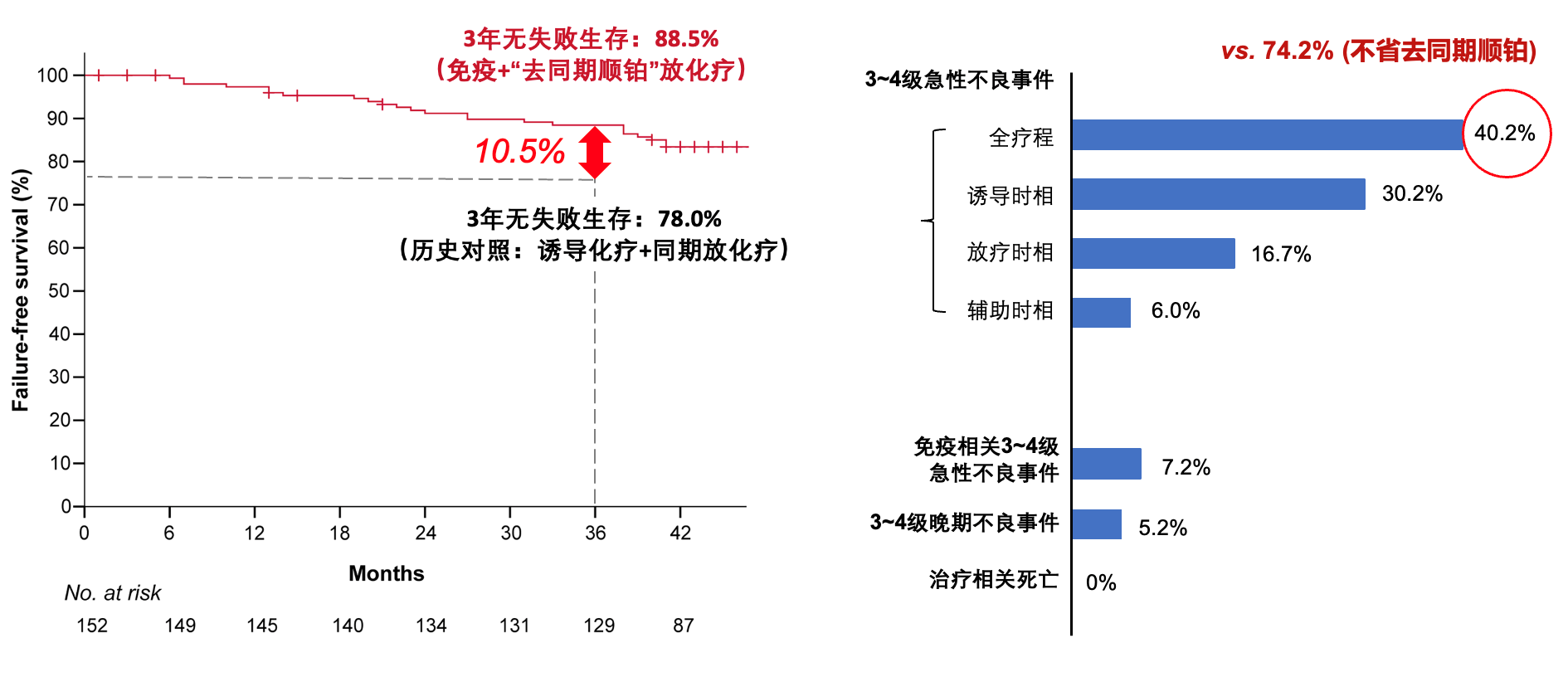 研究发现,采用上述方案可使患者的3年无失败生存达到88.5%的高水平,相较于既往“诱导化疗后同期放化疗”的历史参照值显著提高了10.5%,还可使严重急性毒性发生率降低至40.2%,其中放疗时相的严重急性毒性发生率仅为16.7%。
