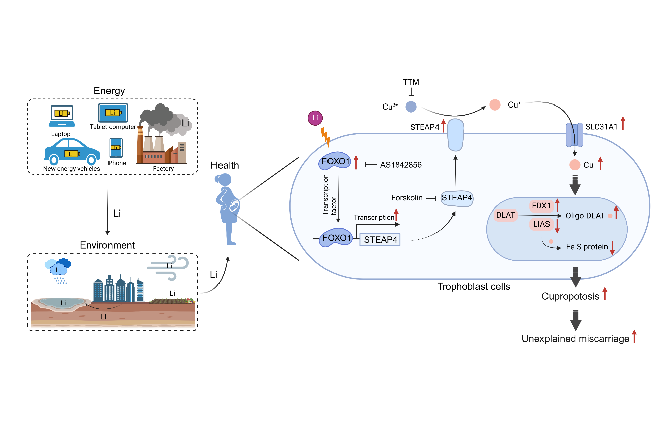 锂(Li)电池已在全球范围内得到广泛应用。过去十年,全球锂产量激增256%,但回收率仅5%,意味着95%的废弃锂被丢弃到环境中,并最终在人体内积累。团队最新研究显示,口服暴露的环境Li会经由“胃肠道→血液→卵巢/子宫/胎盘→胎儿”途径在小鼠体内进行转运,仅5.6倍真实环境暴露剂量即可破坏小鼠卵巢与胎盘结构功能,28倍剂量(当前临床治疗量)即可诱发小鼠流产。在前期研究的基础上,进一步解析锂暴露导致胎盘功能障碍并引发流产的新途径和新机制,为环境锂污染影响女性生殖健康提供新的理论依据。