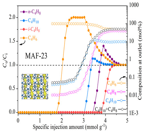 团:研究团队对10例代表性配位聚合物多孔材料的计算机模拟和实验结果证实,形状尺寸合适的离散孔洞最有利于控制柔性客体分子的构型和并反转吸附选择性,而连续的孔道对客体分子的吸附扩散又是必须的。通过模拟计算,发现具有准离散孔洞的柔性多孔材料MAF-23在两种要求中取得平衡,实现了反常而且最优的C4烃类混合物吸附分离顺序。常温常压下将丁二烯、丁烯、异丁烯和丁烷混合物通过MAF-23填充的固定床吸附装置后,吸附最弱的丁二烯最先流出而且纯度很容易达到99.9%,同时可避免常规纯化方法中因加热而产生的丁二烯自聚问题。相关工作发表于国际权威杂志《科学》上,受到了广泛的关注。