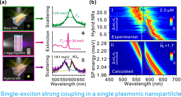 图 一. (a) 单个Au@Ag方棒及单个Au@Ag 方棒/J-聚体强耦合系统的暗场测量结果;(b) 单个Au@Ag 方棒/J-聚体系统中所观测到的反交叉色散关系。