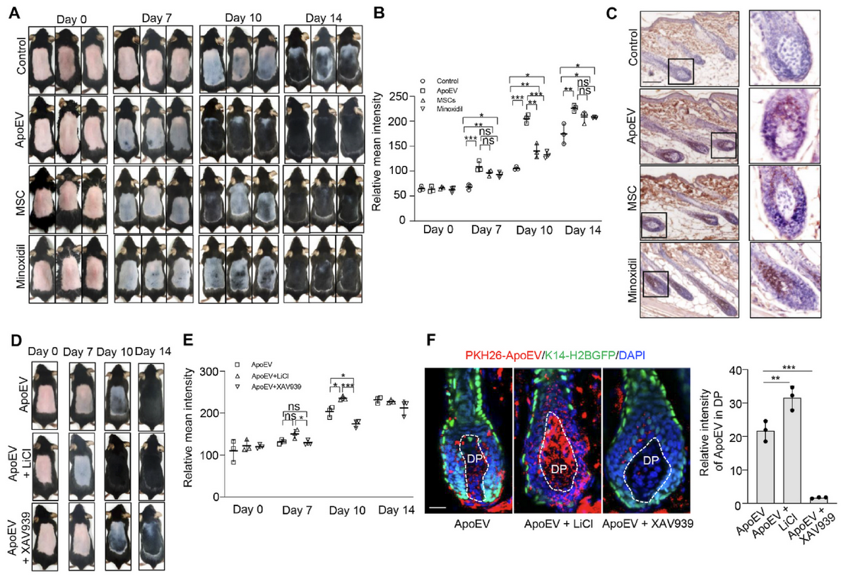 随后,研究人员分离凋亡缺陷小鼠的皮肤和毛囊间充质干细胞 (Mesenchymal stem cells, MSC),发现apoEVs在排出过程中活化MSC中Wnt/β-catenin信号通路,改善MSC性能,并进一步证明apoEVs具有促进伤口愈合和毛发再生的功能。