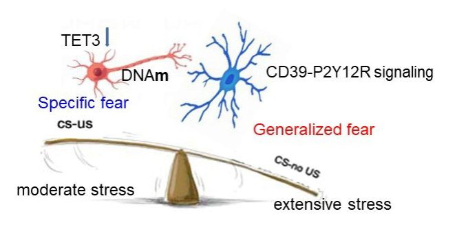 该工作揭示了大脑神经元TET 家族最丰富的 DNA 去甲基化酶TET3,可感知外在环境应激,并将神经可塑性与恐惧泛化过程中的行为适应联系起来。他们发现足部电击强度依赖性地诱导小鼠恐惧泛化和伏隔核 (NAc) 的TET3 表达,而对TET1和TET2的表达没有影响。通过在 NAc灌注抑制剂或 AAV-Tet3-shRNA 病毒来抑制 DNA 去甲基化可增强恐惧泛化和焦虑样行为。值得关注的是,TET3的下调使温和应激下本应形成特异性恐惧记忆转向泛化,提示TET3介导的去甲基化调控了PTSD的易感性。TET3 下调可损害神经元结构可塑性,降低 DNA 羟甲基化 (5hmC),降低突触可塑性相关基因Homer1等的表达,有趣的是,免疫相关基因 B2m等的表达却增加。进一步研究发现,下调TET3激活小胶质细胞和 CD39-P2Y12R 信号通路,而抑制 CD39可逆转 TET3 敲低对恐惧泛化和焦虑的影响。最后,通过CRISPR-Cas9过表达 TET3 可逆转恐惧泛化和焦虑样行为。
