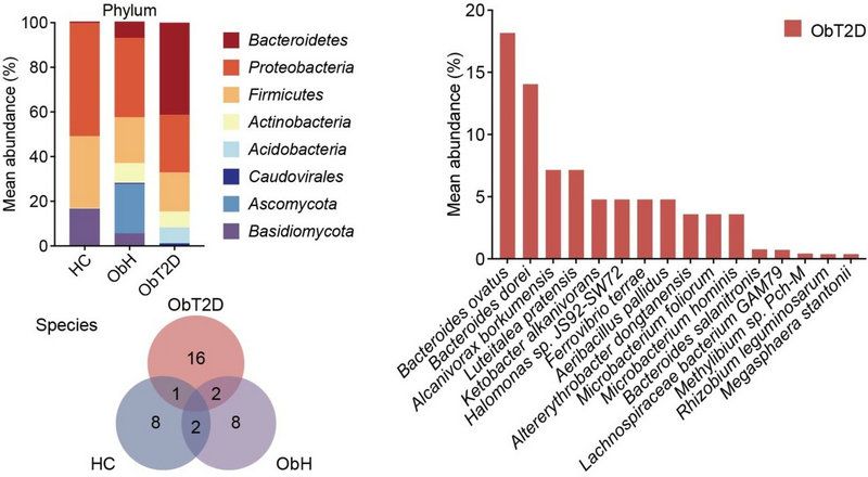 宏基因组测序比较三组血浆样本中微生物组成差异,揭示肥胖合并2型糖尿病(ObT2D)患者血浆中肠道移位卵形拟杆菌特异性增多