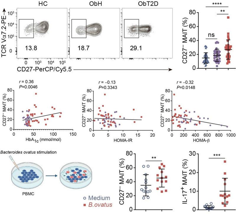 为进一步解析卵形拟杆菌参与T2DM发病的机制,团队锁定了一种与肠道菌群密切相关的固有类T细胞——粘膜相关恒定T(MAIT)细胞。MAIT细胞,在人体中分布广泛、含量丰富,特异性识别微生物来源B族维生素代谢产物,且能感知多种炎性信号,在多种疾病中发挥重要作用。流式细胞分析表明,伴随肥胖进展为2型糖尿病,MAIT细胞数量逐渐下降,而炎性因子IL-17分泌水平逐渐升高。团队进一步解析MAIT细胞中潜在致病性功能亚群,发现CD27阴性MAIT亚群在肥胖合并2型糖尿病组显著上升,其数量与胰岛β细胞功能损伤程度呈负相关,提示该亚群可能参与2型糖尿病的发生发展。