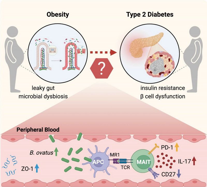 综上所述,本研究通过比较三组参与者的血液样本发现:一种肠道来源的卵形拟杆菌,在“肥胖合并2型糖尿病组”的患者血液中高表达,该菌可刺激MAIT细胞异常活化,通过分泌白介素17(IL-17),引发机体低度炎症反应,导致β细胞破坏和胰岛素抵抗,继而诱发2型糖尿病。