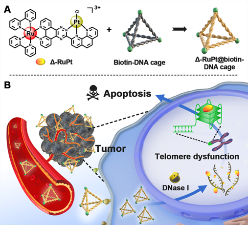 图1. 手性钌-铂双核配合物诱导顺铂耐药肿瘤细胞端粒功能紊乱的作用机理示意图