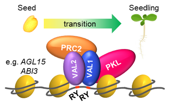 图3. VAL1/2与PKL互作抑制种子成熟程序工作模型