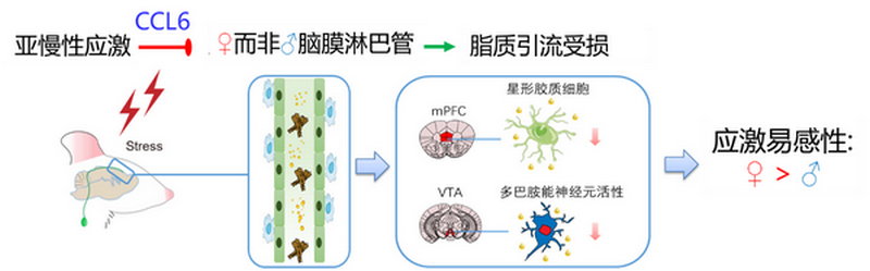 脑膜淋巴管是最近在中枢神经系统中被鉴定的免疫结构,具有清除脑源性分子和运输免疫细胞的重要功能,是连接中枢神经系统和外周免疫系统的桥梁。近日,best365中国官方网站中山医学院叶小菁团队、孙逸仙纪念医院林伟杰团队和中南大学湘雅二院张燕团队合作在Nature Communications期刊发表题为“A functional role of meningeal lymphatics in sex difference of stress susceptibility in mice”的研究论文。该论文报导了亚慢性可变应激(sub-chronic variable stress,SCVS)诱导雌鼠而非雄鼠出现抑郁样和焦虑样行为,并伴随着雌鼠而非雄鼠脑膜淋巴管结构和功能发生损伤,而调控脑膜淋巴管可改变雌雄小鼠对应激诱发的抑郁样和焦虑样症状的易感性。研究人员进一步发现,应激诱导脑膜淋巴管内皮细胞表达趋化因子CCL6损伤其自身,进而导致甘油三酯等脂质分子在情绪关键脑区前额叶皮层(mPFC)和腹侧被盖区(VTA)累积,引发mPFC星形胶质细胞数量和VTA多巴胺神经元活性异常。