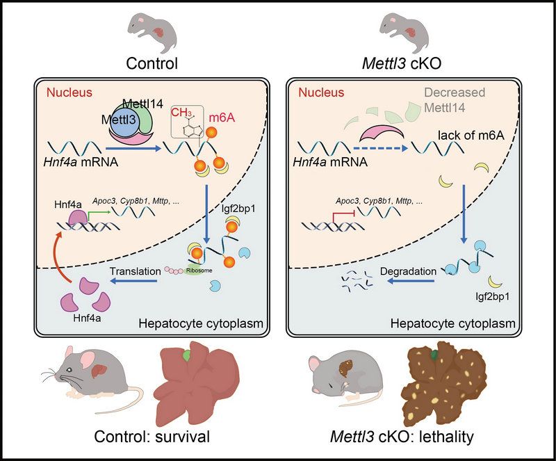 肝脏是机体最大的实质器官,也是新陈代谢的中心站。肝脏发育和成熟是一个复杂精细有序的过程,受到胞内外信号、表观遗传调控和转录调控等多层次严密调控。N6-甲基腺苷(m6A)是真核生物mRNA最丰富的修饰,调控转录、核质运输、稳定性和翻译等多个RNA代谢过程。m6A受到甲基化酶和去甲基化酶的动态调控,其中由催化亚基Mettl3和调节亚基Mettl14、 Wtap等组成甲基转移酶复合物负责将m6A加载到转录本上特定位点,去甲基化酶ALKBH5或FTO负责移除m6A修饰。既往研究报道了m6A修饰参与干细胞分化、肿瘤发生等众多生理病理过程。然而,m6A修饰在哺乳动物肝脏发育中的作用尚无系统研究。
