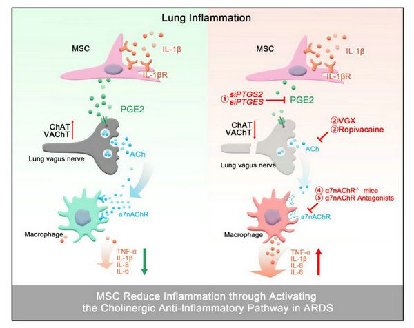 研究人员构建小鼠ARDS模型,发现静脉输注MSC明显缓解了肺损伤症状,同时,胆碱能系统相关基因ChAT、VAChT在肺组织中表达量显著增加,提示CAP可能在MSC治疗ARDS的过程中发挥重要作用。课题组随后证实MSC主要通过合成、分泌前列腺素E2促进ChAT表达和乙酰胆碱产生。