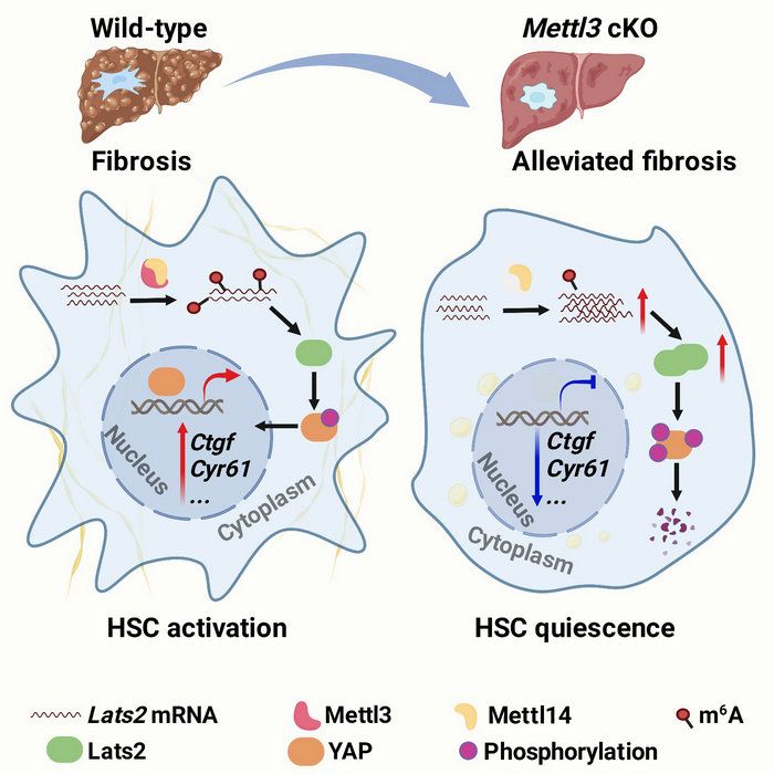 肝星状细胞作为肝脏特有的一种非实质细胞,在肝纤维化进程中发挥着关键作用,其在正常状态下呈静息状态,当肝脏受到物理、化学和微生物感染等病理因素刺激时,肝星状细胞被激活,转变为肌成纤维细胞,并开始大量增殖,成为细胞外基质的主要来源细胞。干预肝星状细胞的活化、增殖和存活有望逆转肝纤维化进程。研究团队通过构建Lrat-Cre介导的肝星状细胞特异性敲除m6A甲基转移酶Mettl3的小鼠(Mettl3 cKO小鼠),发现肝星状细胞特异性敲除Mettl3不影响小鼠发育,但在四氯化碳(CCl4)诱导的肝细胞损伤导致的肝纤维化模型和DDC(3,5-diethoxycarbonyl-1,4-dihydro-collidine)诱导的胆汁淤积导致的纤维化模型中,肝星状细胞特异性敲除Mettl3可以显著降低肝损伤水平、减缓肝纤维化进展。细胞实验也发现敲低/敲除Mettl3显著抑制肝星状细胞的活化和纤维化基因表达。这些结果表明靶向Mettl3可有效抑制肝星状细胞活化和肝纤维化进展,进一步的机制探究证实Hippo/YAP信号通路在其中发挥着重要作用,为肝纤维化早期干预和药物研发提供了新靶标。