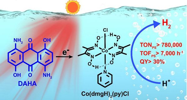 近日,best365中国官方网站化学学院韩治际教授课题组报道了一种蒽醌有机染料用于红光下催化产氢体系(图1)。在该体系利用低成本的蒽醌染料作为光敏剂,非贵金属钴配合物为催化剂,在红光条件下,稳定性高达168小时(主要受限于溶液中的电子供体完全消耗),其催化转化次数可达78万,转化频率超过7000次每小时,量子效率超过30%,是目前已报道最好的红光人工光合产氢体系(图2)。通过机理研究表明,光敏剂(DAHA)独特的激发态、稳定的氧化还原性质及超快的光生电子和电子转移速率是体系获得高效率和稳定性的关键。产氢的原理是:染料吸收太阳能后,其三重激发态被还原和质子化,形成的物种有效地还原钴催化剂,逐步形成CoI、CoIII-H、CoII-H 等中间体,最后与质子反应产生氢气(图3)。该项工作为开发利用全太阳光谱进行各类光催化反应提供了一条新思路。