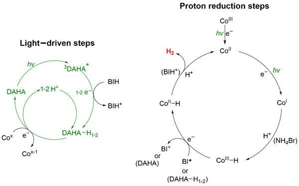 在光合作用中,红光驱动光催化质子还原是能量转换的关键步骤。然而,目前长波长产氢体系的研究主要集中在贵金属,且催化效率仍旧没有突破性的进展。当前主要任务在于:1. 开发长波长具有优异吸收、光生电子和电子转移效率高的光敏剂;2. 具有高效廉价的的非贵金属催化剂;3. 体系能与其它氧化体系更好的结合。蒽醌类光敏剂是最古老的染料之一,自然界含量丰富、氧化还原性能稳定、波长调控性强、制备简单,是本课题组近年来的一个研究重点。