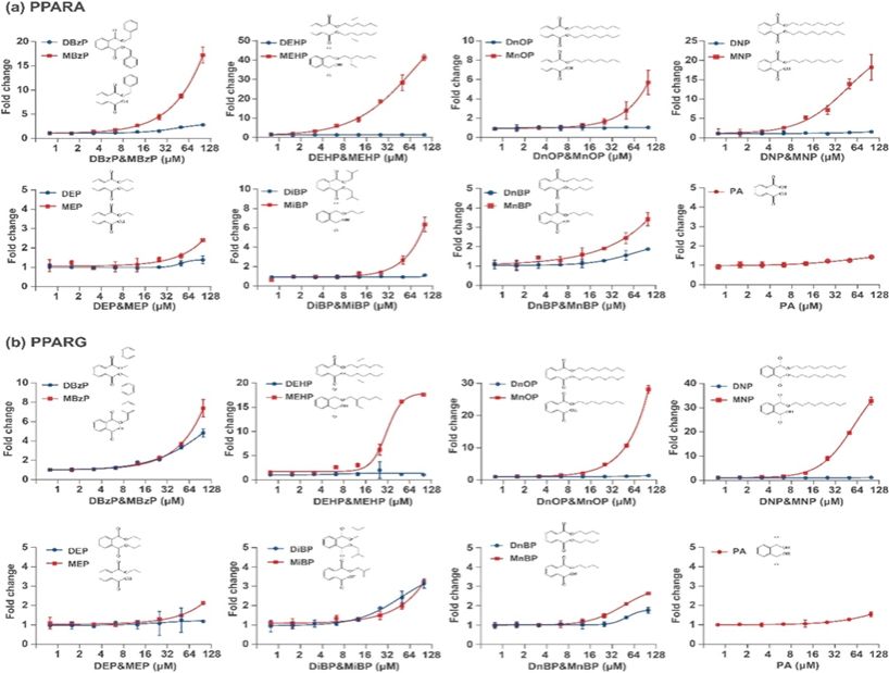 图2 PAEs和 mPAEs对中华白海豚PPARA(a)和PPARG(b)的转录活性