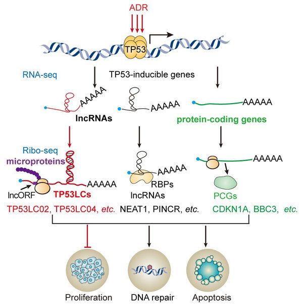 中大新闻网讯(通讯员杨建华)TP53 (p53)是最重要的肿瘤抑制因子,对于维持细胞基因组完整性至关重要。为应对 DNA 损伤,p53 蛋白被激活并作为转录因子调控大量的蛋白质编码基因、微RNA(miRNA)和长非编码RNA(lncRNA)等的表达。我们前期研究发现了p53调控的LTR逆转座子衍生的lncRNA(LTR-lncRNA)促进DNA同源重组修复的新功能(EMBO Reports, 2019)。有趣的是,最近的研究发现一些lncRNA可以进一步编码多肽(微肽)在重要的生理与病理过程中发挥调控功能。然而,p53调控的lncRNA是否可以编码多肽及作为多肽发挥重要的生物学功能仍有待阐明。