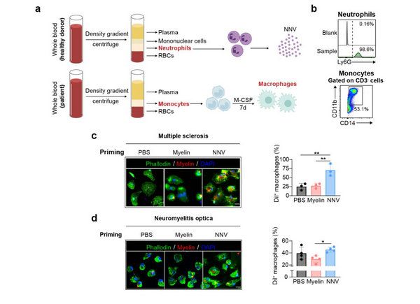 研究人员还在临床多发性硬化(MS)和视神经脊髓炎(NMO)患者中展开探索。研究初步发现,NNV可促进MS患者外周血中的巨噬细胞清除髓鞘碎片。