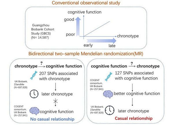研究人员首先基于广州生物库队列开展了一项观察性研究。广州生物库队列研究(Guangzhou Biobank Cohort Study, GBCS)是 2003 年由广州市第十二人民医院、香港大学和英国伯明翰大学合作开展的一项前瞻性队列研究。GBCS于2003~2008年间完成基线调查和体格检查,共纳入了30,430名50岁以上的广州常住居民。通过2008-2012年收集的随访数据,本研究基于14,582例广州中老年社区人群开展。多变量线性回归分析结果显示,睡眠中点和认知功能评分呈正相关,即较晚的睡眠中点与较高的认知水平相关。在调整了性别、年龄、社会经济状况、身体质量指数、生活方式、疾病史等混杂因素以后相关关系依然存在 (MMSE: β=0.14; 95% 置信区间(CI), 0.09-0.19; DWRT: β=0.07; 95% CI, 0.04-0.11)。