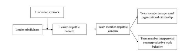 由此,作者基于动机的共情理论和正念文献,考察了共情关注的交叉效应,从而捕捉领导正念效果的作用机制;鉴于正念文献强调了正念效果在负面情境下会得到更大程度的发挥,作者通过关注团队的阻碍型压力源探索了领导正念效果的边界条件。