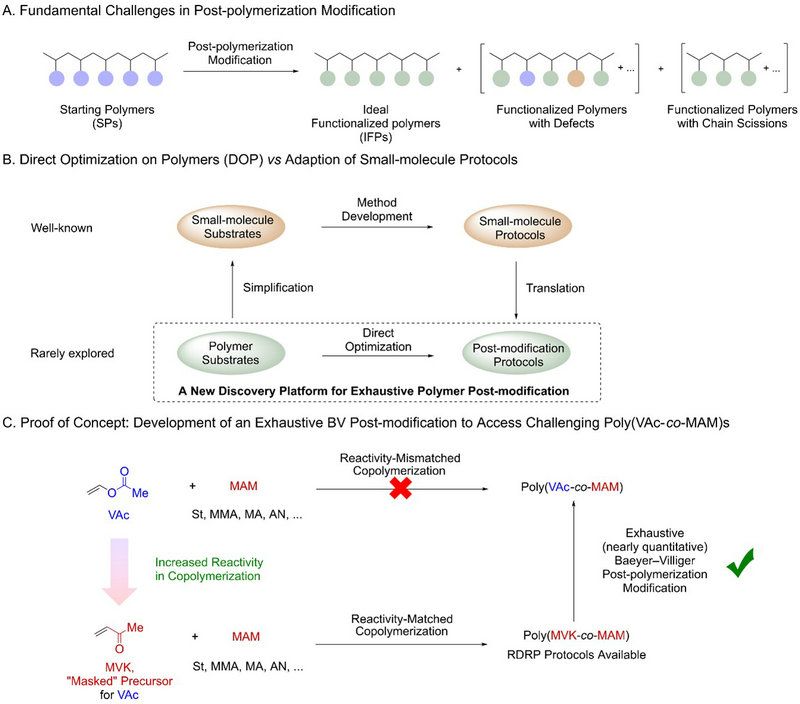图一 (a)聚合物后修饰中面临的重要挑战;(b)聚合物直接优化法(DOP策略);(c)聚合物彻底Baeyer-Villiger氧化后修饰制备挑战性醋酸乙烯酯共聚物