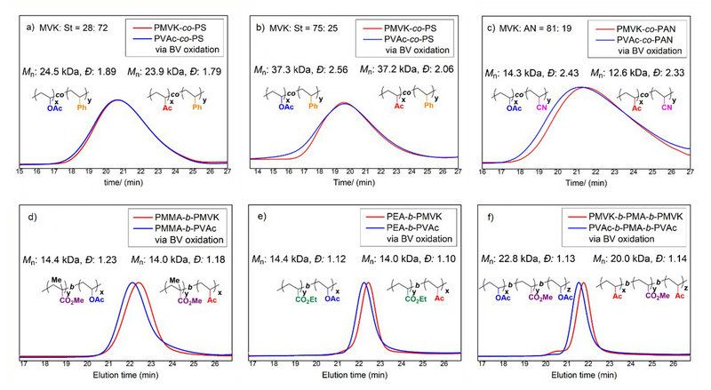 最近,best365中国官方网站化学学院李乐教授团队针对上述问题提出了通过聚合物直接优化法(Direct Optimization on Polymers, DOP)开发新型后修饰反应的新策略(图一,b),在小分子方法学和聚合物后修饰方法学之间搭建起一座桥梁。他们利用DOP策略成功开发了聚合物的彻底Baeyer−Villiger(BV)氧化反应(图一,c),解决了醋酸乙烯酯和高活性乙烯基单体的共聚物难以合成的问题,充分展示了该策略的有效性。众所周知,氧化反应通常难以控制,容易导致聚合物缺陷和降解。但是,他们的研究表明,利用新开发的聚合物彻底BV氧化后修饰方法可以在不影响聚合物的分子量的前提下,将数均分子量为66 kDa,聚合度高达1000的聚合物中的酮羰基完全转化为醋酸乙烯酯(Vinyl Acetate, VAc)结构单元,从而为制备之前无法合成的醋酸乙烯酯共聚物提供了一种通用性的解决方案。如图二所示,这些共聚物在彻底BV后修饰前后的分子量、分子量分布以及共聚比例均基本保持不变,说明了后修饰后的聚合物未发生明显的降解,各种可能的副反应得到了最大程度上的抑制。共聚单体的范围涵盖了苯乙烯(图三,a和b)、丙烯腈(图三,c)、丙烯酸酯(图三,e和f)和甲基丙烯酸酯类(图三,d)在内的大多数高活性单体。同时,共聚物类型既可以是无规共聚物(图三,a、b和c),也可以是多嵌段聚合物(图三,d、e和f)。此外,作者进一步开发了“聚合/后修饰一锅合成法”,为此类材料的规模制备奠定了基础。初步研究表明,此类聚合物在高温、潮湿环境下表现出了远超传统聚醋酸乙烯酯胶粘剂的粘接性能。