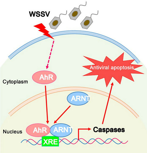 养殖水体中的苯并芘、多氯联苯等有机毒物来自工业废水和废气,因其亲脂性和难降解性会随着生物链流动富集,不仅直接威胁对虾生存,还会影响食用者的健康。芳香烃受体(aryl hydrocarbon receptor,AhR)是一类配体依赖的转录因子,能够识别苯并芘和多氯联苯激活机体解毒途径。何建国教授团队发现凡纳滨对虾AhR响应WSSV感染,通过与LvARNT偶联直接靶向LvCaspase-1(人Caspase-3同源基因)的启动子,调节LvCaspase-1的表达,诱导细胞凋亡,发挥抗病毒功能。该成果首次揭示AhR家族蛋白通过调控caspase表达以建立与细胞凋亡的直接联系,表明LvAhR是提高对虾抗病性和抗逆性的潜在选育靶点。