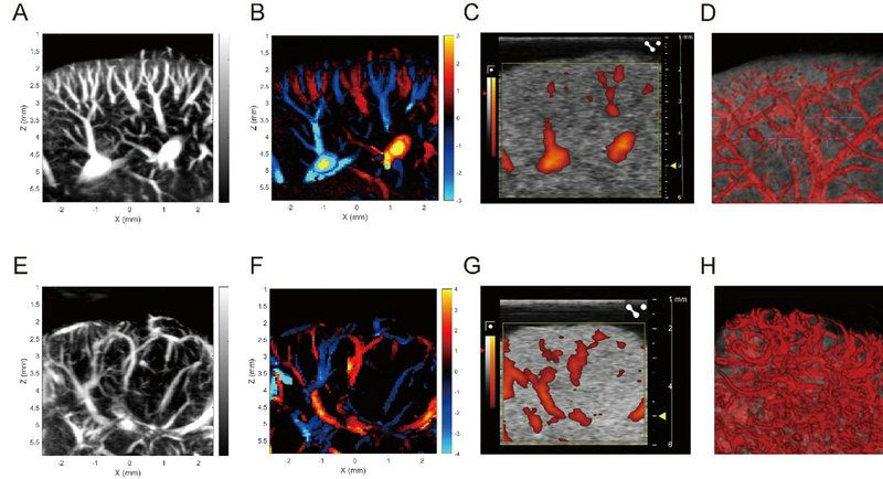 图1:超声超敏微血管成像(UMI)技术在健康(上排)及肝硬化(下排)大鼠成像效果与传统超声能量多普勒(C, G)及micro-CT(D, H)对比