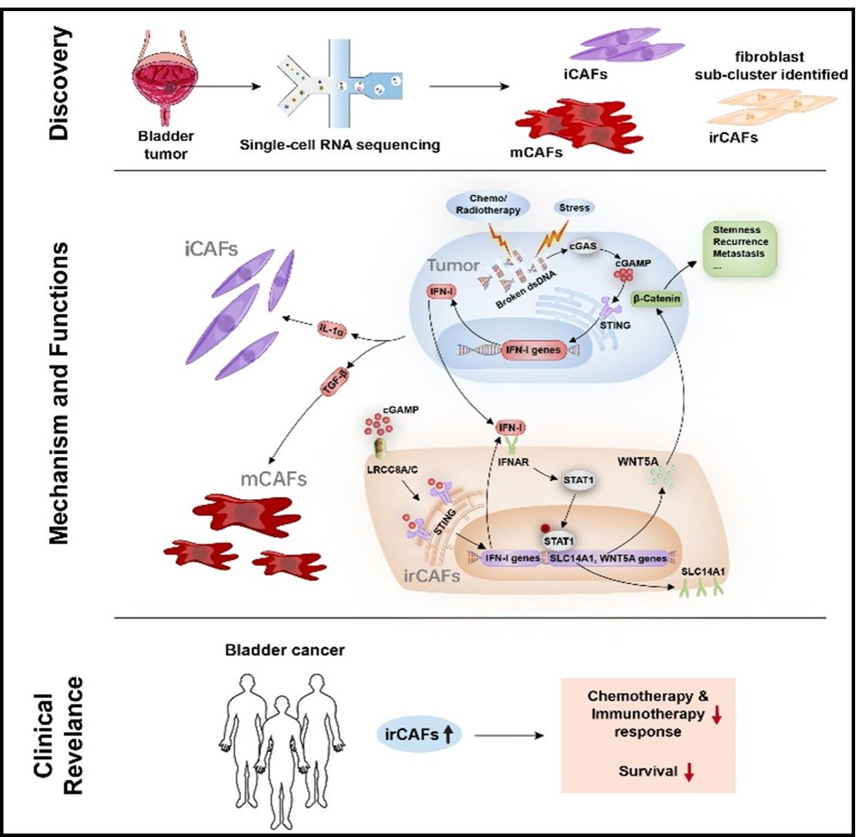 该研究进一步阐明了恶性肿瘤成纤维细胞亚群的多样性及其功能的差异性,论证了干扰素信号在促进免疫活化和介导肿瘤进展的两面性,对于开发靶向成纤维细胞的新型治疗方案有重要的临床意义。同时,该研究为改善中、晚期膀胱癌患者的化疗疗效和预后提供了新的思路,为膀胱癌精准治疗方案的制定提供了重要理论基础。