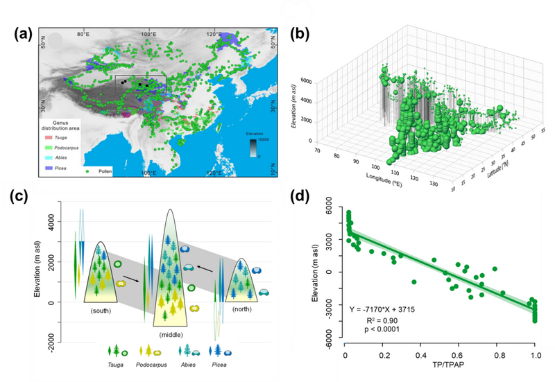 该研究利用东亚现代表土孢粉数据库建立针叶类植物花粉与海拔定量关系,该数据库由黄康有、郑卓团队联合国内外多家合作单位历经二十多年长期积累建立而成,逾5000个样点分布覆盖了我国及周边地区绝大部分植被类型和气候带,已在东亚地区古气候研究中获得广泛应用,此次研究则成功拓展了该数据库和孢粉代用指标的应用领域。据悉,该团队近年来利用孢粉学方法在我国南方地区第四纪古气候、海平面变化、史前人类活动与农业起源等方面研究中取得了系列重要成果,研究成果发表在Science、PNAS、Quaternary Science Reviews、Journal of Biogeography、Science in China Series D: Earth Sciences等权威期刊上。