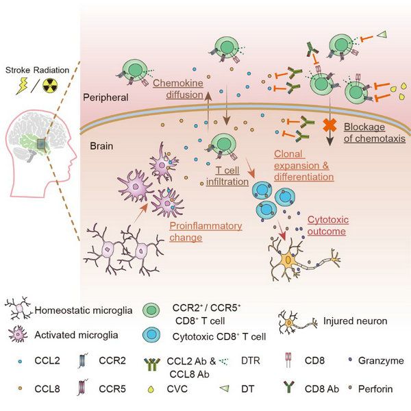 本研究首次证明了大脑在受到射线或者脑缺血的刺激后,小胶质细胞通过分泌趋化因子CCL2及CCL8,吸引外周CD8+ T细胞浸润,释放穿孔素和颗粒酶等细胞毒性因子,引起大脑的继发性损伤。同时,本文也首次为通过抑制T淋巴细胞介导的获得性免疫来防治放射性脑损伤和脑缺血等脑疾病提供了创新理论和实验基础。