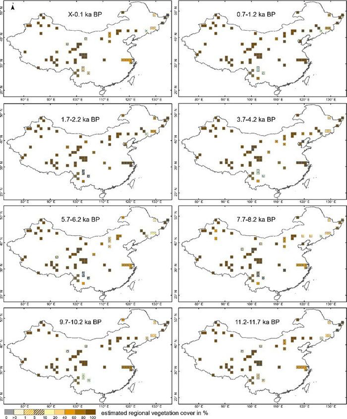图2:REVEALS模型重建全新世草本植物盖度百分比变化动态(选取其中的八个时间窗为代表)百分比间隔为 0,> 0 %–1 %),> 1 %–5 % ,> 5 %–10 % ,> 10 %–20 %, 和 > 20 %–100%, 灰色代表本时间段无盖度,其他时间段有盖度。每个栅格内的蓝色圆圈代表重建盖度的误差,用变异系数表示(变异系数=重建标准差除以重建的数值),如果标准差大于数值,蓝色圆圈填满栅格,代表该数据误差较大,重建结果不可靠。