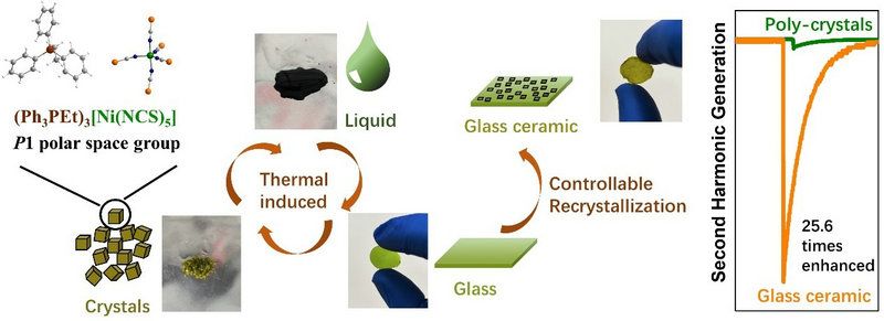 近日,该课题组利用体积大且热稳定高的烷基三苯基鏻阳离子(Ph3PEt+)与异硫氰根金属配位单元组装,成功合成了一例新型杂化晶体(Ph3PEt)3[Ni(NCS)5]。该晶体结晶于极性P1空间群,且表现出罕见的“晶体–液体–玻璃–晶体”可逆转变。利用该可逆相态变化,他们将玻璃样品进行热压成形,之后退火可控部分晶化,从而在玻璃相中均匀镶嵌上微晶颗粒(即形成玻璃陶瓷)。内部微晶的极性,使得该玻璃陶瓷可表现出显著的倍频效应,在不经任何极化处理的情况下,其倍频强度就能达到其多晶形态的25.6倍,是经典倍频晶体KH2PO4的3.1倍。