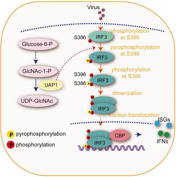 图2 UAP1通过催化IRF3焦磷酸化,调控IRF3活性及其I型干扰素信号通路的工作模型