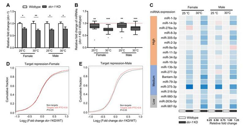 图1. 果蝇microRNA介导的渠化调控研究体系。图中示意黑腹果蝇dicer-1敲低品系,在该遗传背景中,基因组中microRNA的表达水平被广泛且微弱地下调。